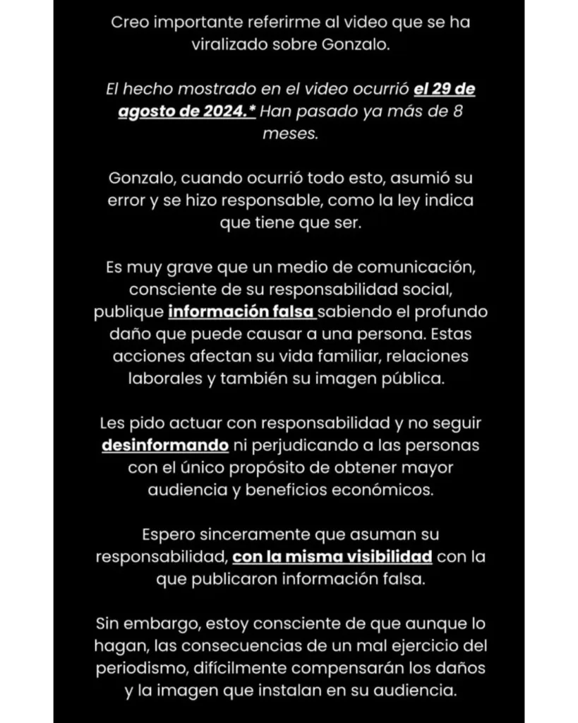 “Es muy grave que un medio de comunicación, consciente de su responsabilidad social, publique información falsa sabiendo el profundo daño que puede causar a una persona. Estas acciones afectan su vida familiar, relaciones laborales y también su imagen pública”, puntualizó.