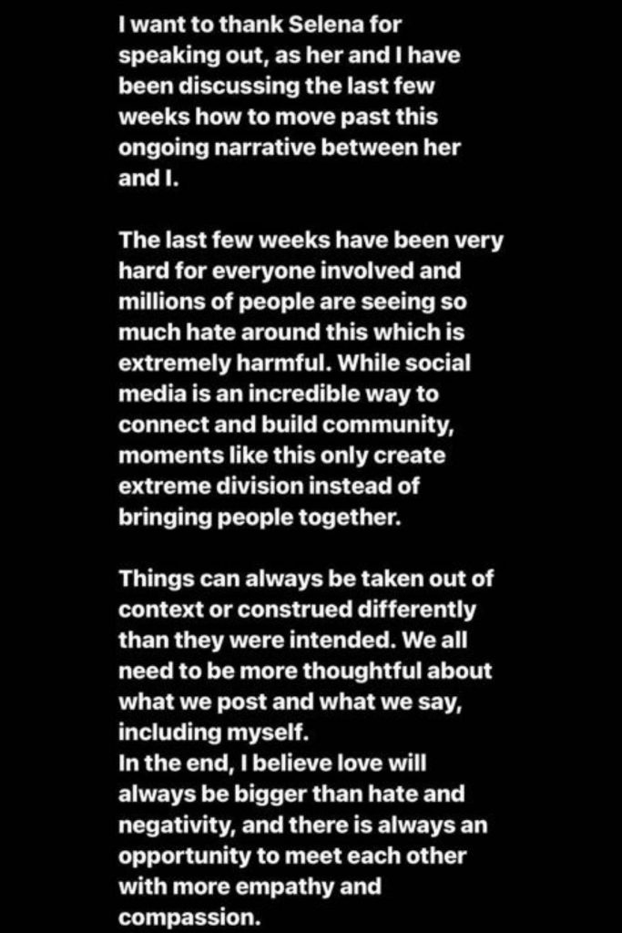 “Quiero agradecerle a Selena por apoyarme. Ella y yo hemos estado discutiendo las últimas semanas sobre cómo superar esta narrativa en curso entre nosotras”, comenzó la modelo.