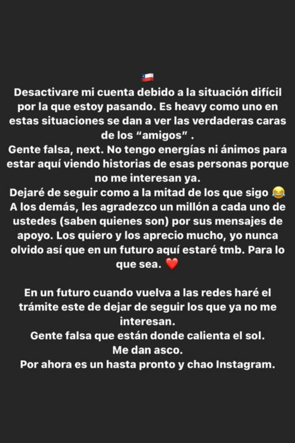"No tengo energías ni ánimo para estar aquí viendo historias de esas personas porque no me interesan ya. Dejaré de seguir como a la mitad de los que sigo. A los demás les agradezco un millón a cada uno de ustedes por sus mensajes de apoyo", prosiguió con su explicación.