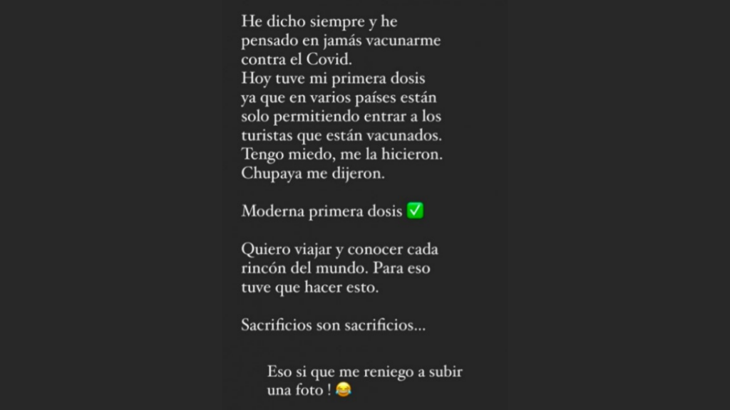 "He dicho siempre y pensado en jamás vacunarme contra el COVID. Hoy tuve mi primera dosis ya que en varios países están solo permitiendo entrar a los turistas que están vacunados" sostuvo el joven. Además, con esto se revelarían las verdaderas intenciones del joven, al recibir la vacuna.