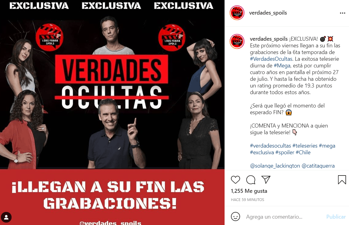 "¡EXCLUSIVA! 💣💥 Este próximo viernes llegan a su fin las grabaciones de la 6ta temporada de #VerdadesOcultas. La exitosa teleserie diurna de #Mega, está por cumplir cuatro años en pantalla el próximo 27 de julio. Y hasta la fecha ha obtenido un rating promedio de 19.3 puntos durante todos estos años. ¿Será que llegó el momento del esperado FIN? 😱", fue lo que escribió la cuenta en su perfil de Instagram.