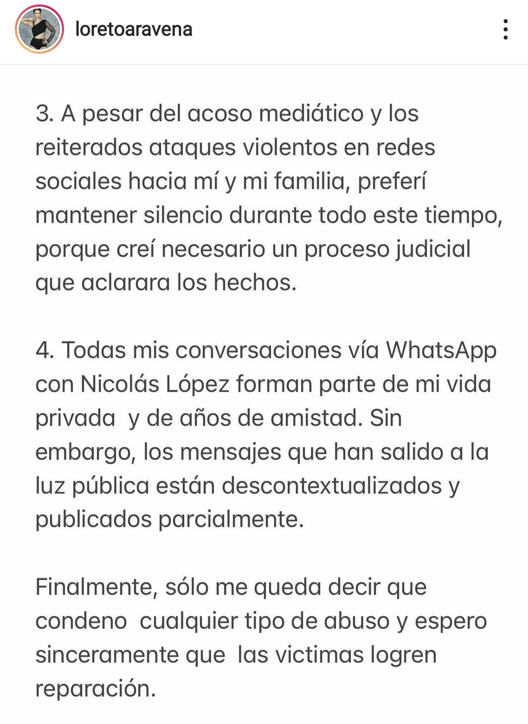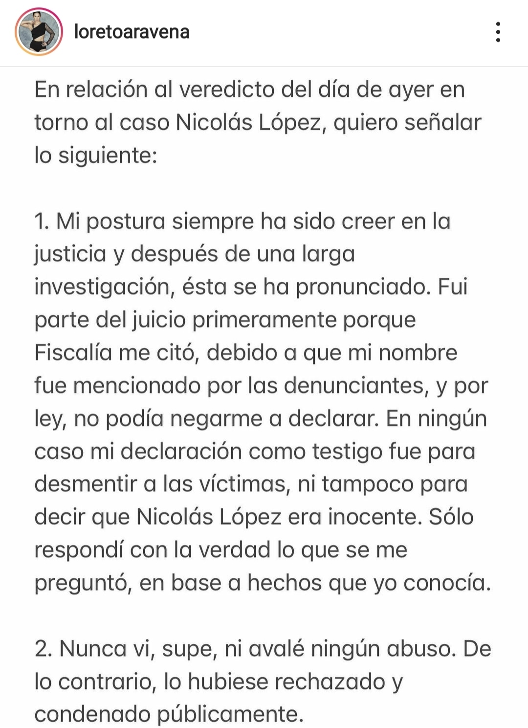 "En ningún caso mi declaración como testigo fue para desmentir a las víctimas, ni tampoco para decir que Nicolás López era inocente. Solo respondí con la verdad lo que se me preguntó, en base a hechos que yo conocía", agregó Loreto Aravena en el comunicado que subió a su cuenta de Instagram.