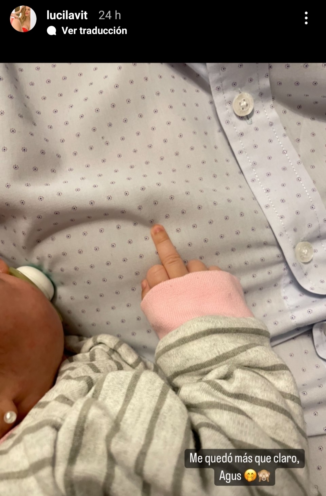 "Me quedó más que claro Agus 🤭🙈", escribió la influencer al compartir una imagen de la niña levantado el dedo medio, también conocido como dedo del insulto, en lenguaje elegante.