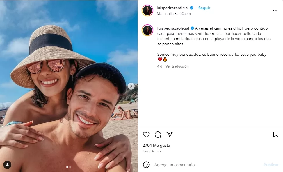 “A veces el camino es difícil, pero contigo cada paso tiene más sentido. Gracias por hacer bello cada instante a mi lado, incluso en la playa de la vida cuando las olas se ponen altas”, detalló Luis Pedraza en la plataforma.