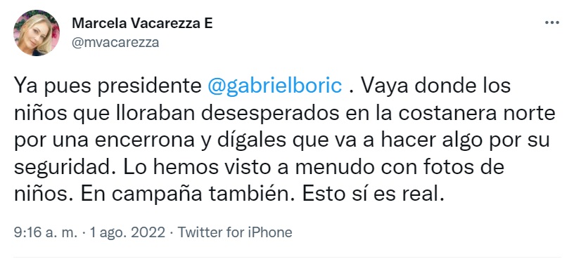 "Ya pues presidente @gabrielboric. Vaya donde los niños que lloraban desesperados en la costanera norte por una encerrona y dígales que va a hacer algo por su seguridad. Lo hemos visto a menudo con fotos de niños. En campaña también. Esto sí es real", expresó Vacarezza, quien recibió de vuelta todo tipo de comentarios.