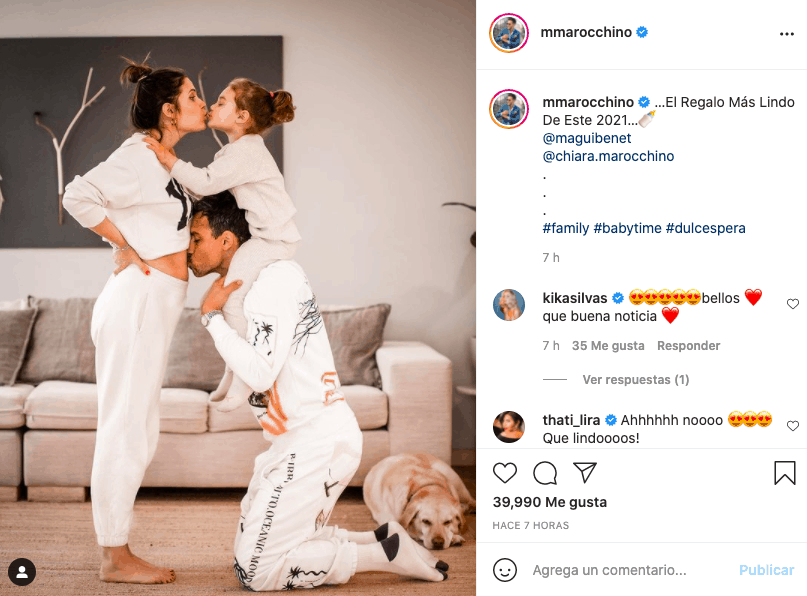 "El regalo más lindo de este 2021", redactó junto a una foto donde sostiene en sus hombros a Chiara y le besa el vientre a Magui, todos acompañados también por su inseparable mascota: una perrita labradora llamada Mia.