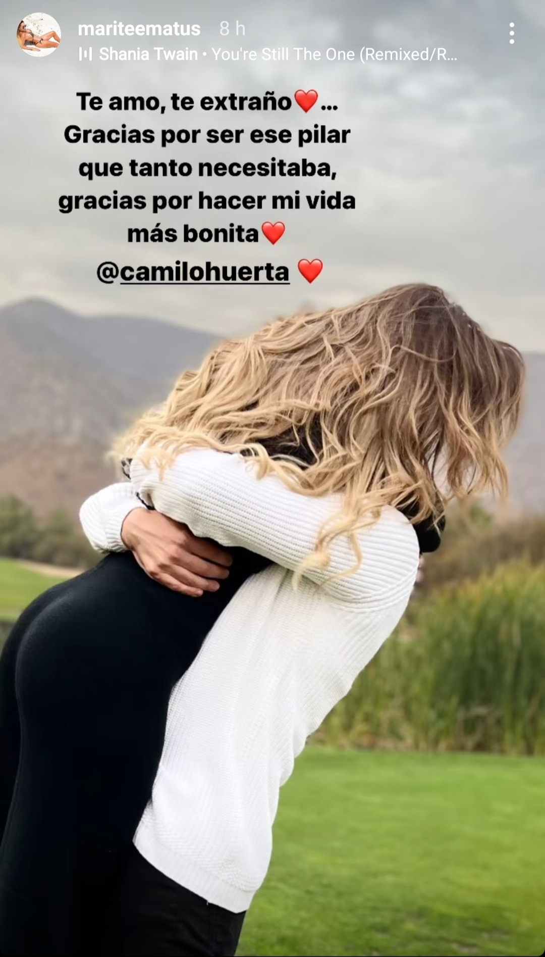 "Te amo, te extraño... Gracias por ser ese pilar que tanto necesitaba, gracias por hacer mi vida más bonita @camilohuerta", escribió Marité Matus en una postal que subió a sus historias de Instagram.
