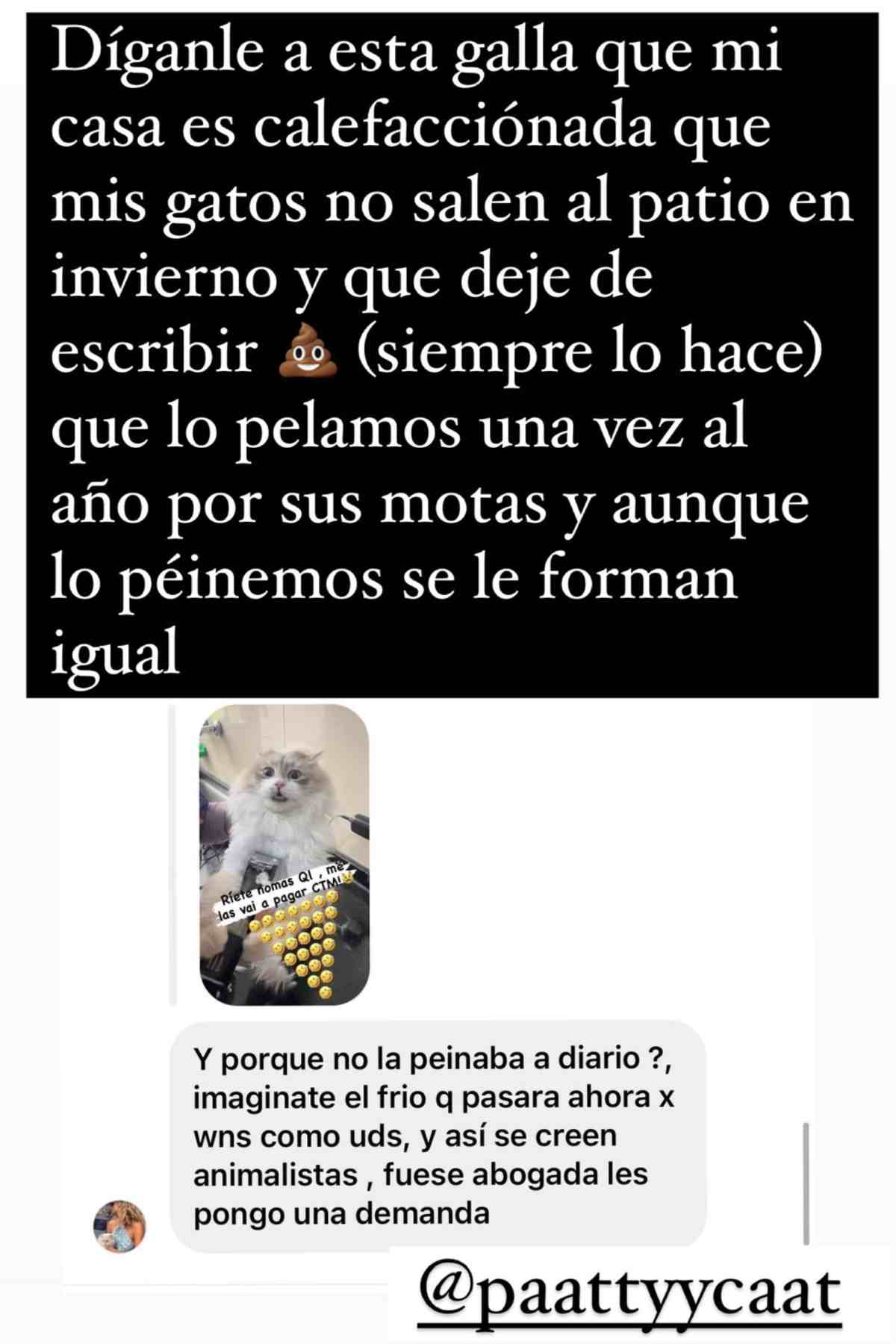Luego la influencer explicó que a su gato "lo pelamos una vez al año por sus motas y aunque lo peinemos se le forman igual", etiquetando en la publicación a la mujer que le reclamó por su decisión.