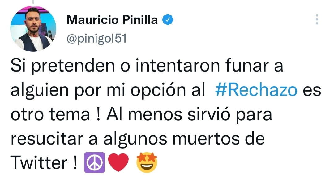"Si pretenden o intentaron funar a alguien por mi opción al Rechazo es otro tema. Al menos sirvió para resucitar a algunos muertos de Twitter", concluyó el ex seleccionado nacional en su cuenta de Twitter.
