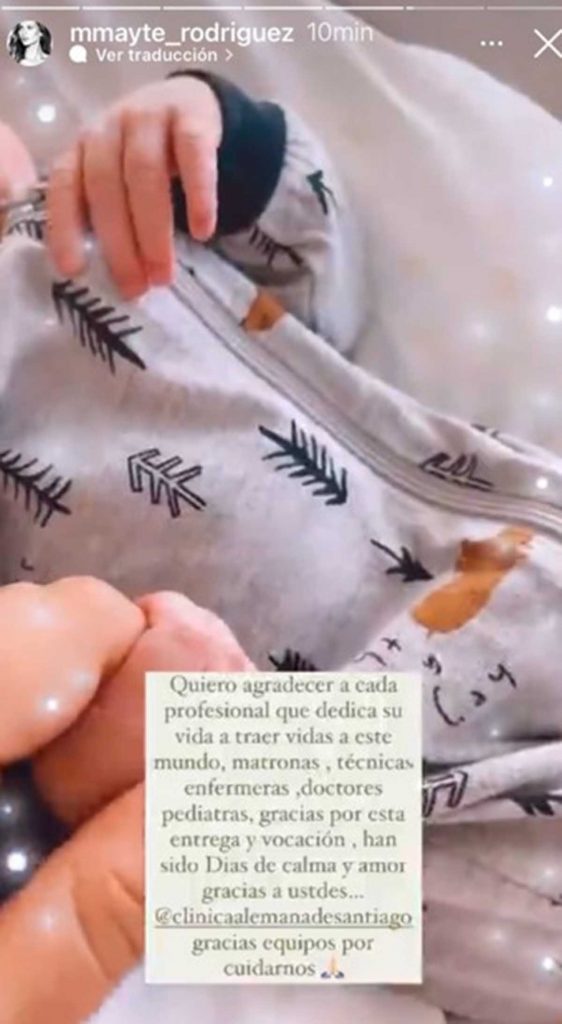 "Quiero agradecer a cada profesional que dedica su vida a traer vidas a este mundo. Matronas, técnicas, enfermeras, doctores, pediatras, gracias por esta entrega y vocación, han sido días de calma y amor gracias a ustedes. @clinicaalemanadesantiago gracias equipos por cuidarnos", escribió en un primer mensaje Mayte Rodríguez.