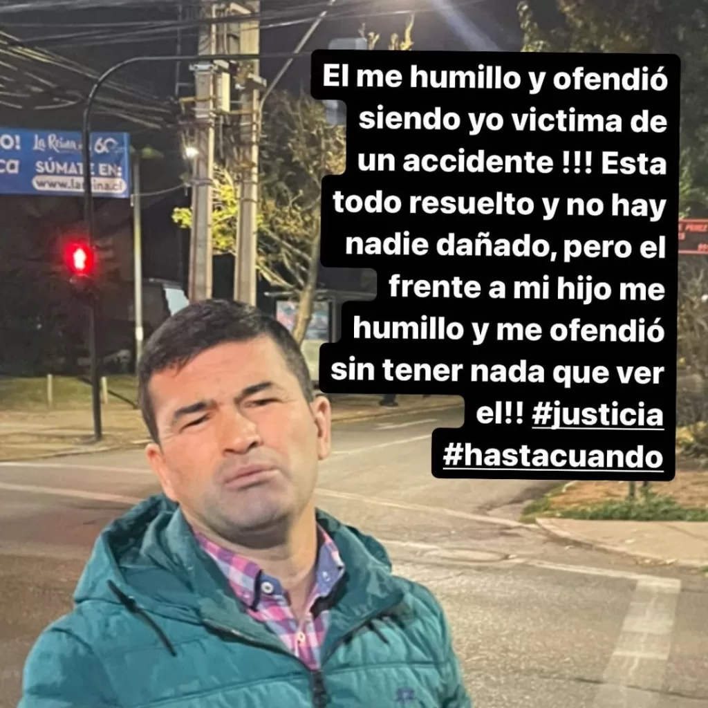 "El me humilló y ofendió, siendo yo víctima de un accidente!!! Está todo resuelto y no hay nadie dañado pero él frente a mi hijo me humilló y me ofendió sin tener nada que ver él", escribió junto a los hashtag #justicia #hastacuando. Puedes revisar el contenido, a continuación.