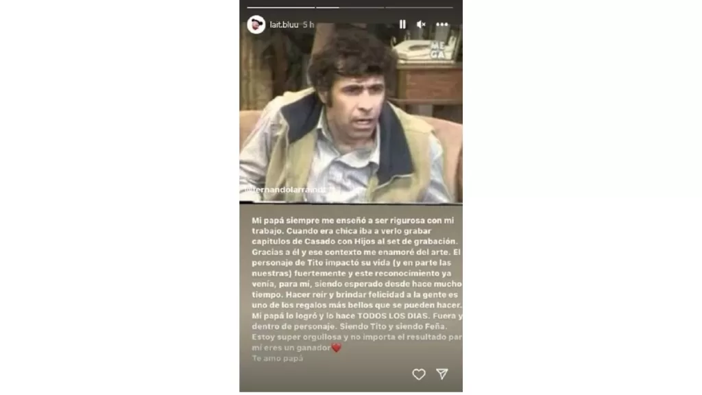 "Mi papá siempre me enseñó a ser rigurosa con mi trabajo. Cuando era chica iba a verlo grabar capítulos de Casado con Hijos al set y gracias a él y ese contexto, me enamoré del arte", detalló en sus historias de Instagram.