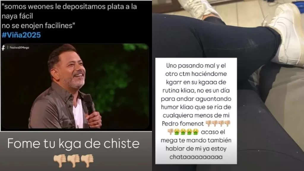 "Fome tu caga de chiste" y "Uno pasándolo mal y el ctm haciéndome cagar en su caga de rutina culiá. No es un día para andar aguantando humor culiao. Que se ría de cualquiera menos de mi, Pedro Fomenot. Acaso el Mega te mandó también a hablar de mí. Ya estoy chata", expresó en un inicio en sus historias, revelando que sufrió un problema en su auto.