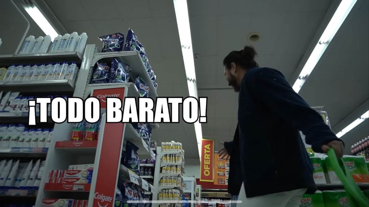 En el video se ve al comediante muy feliz dentro del supermercado, expresando a la cámara: "Está todo barato".