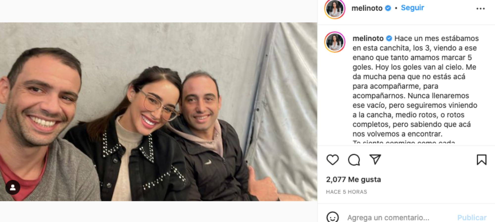 "Hace un mes estábamos en esta canchita, los tres, viendo a ese enano, que tanto amamos marcar cinco goles, hoy los goles van al cielo. Me da mucha pena que no estes acá para acompañarme, para acompañarnos", Melina Noto dedicó a su hermano, en su cuenta de Instagram.