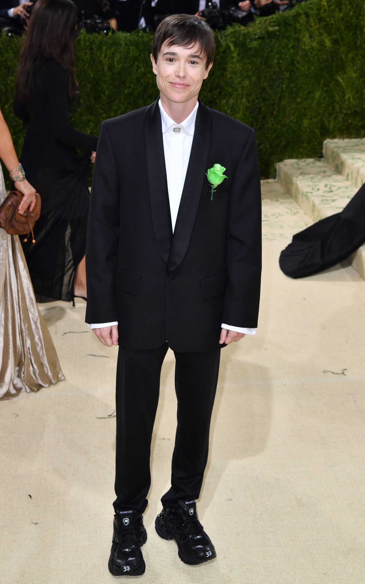 Aunque el traje de Elliot Page en el MET era sobrio, estuvo decorado por una rosa verde en el bolsillo de su chaqueta.