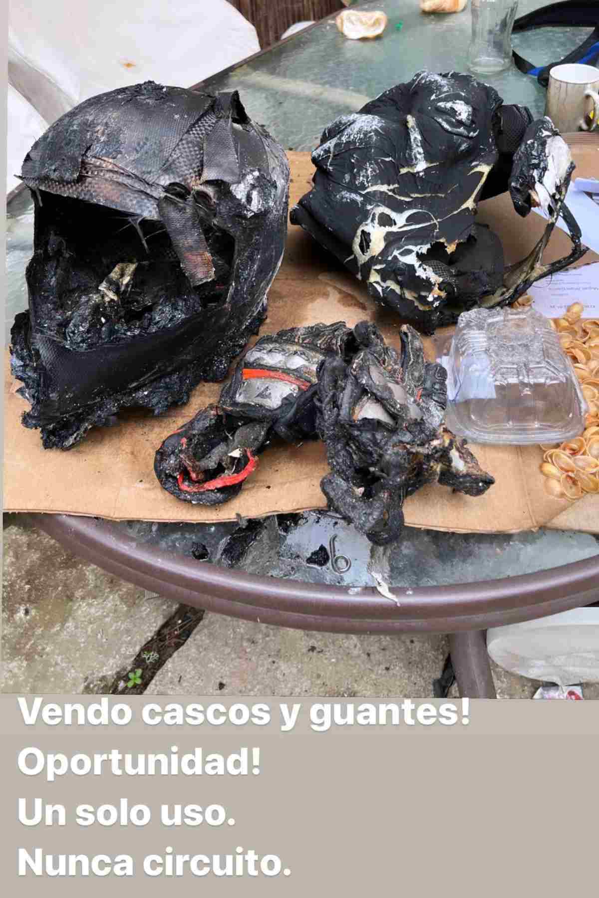 Además, después en sus historias subió otra imagen, donde se ve cómo quedó su casco y guantes para andar en moto tras el incendio.