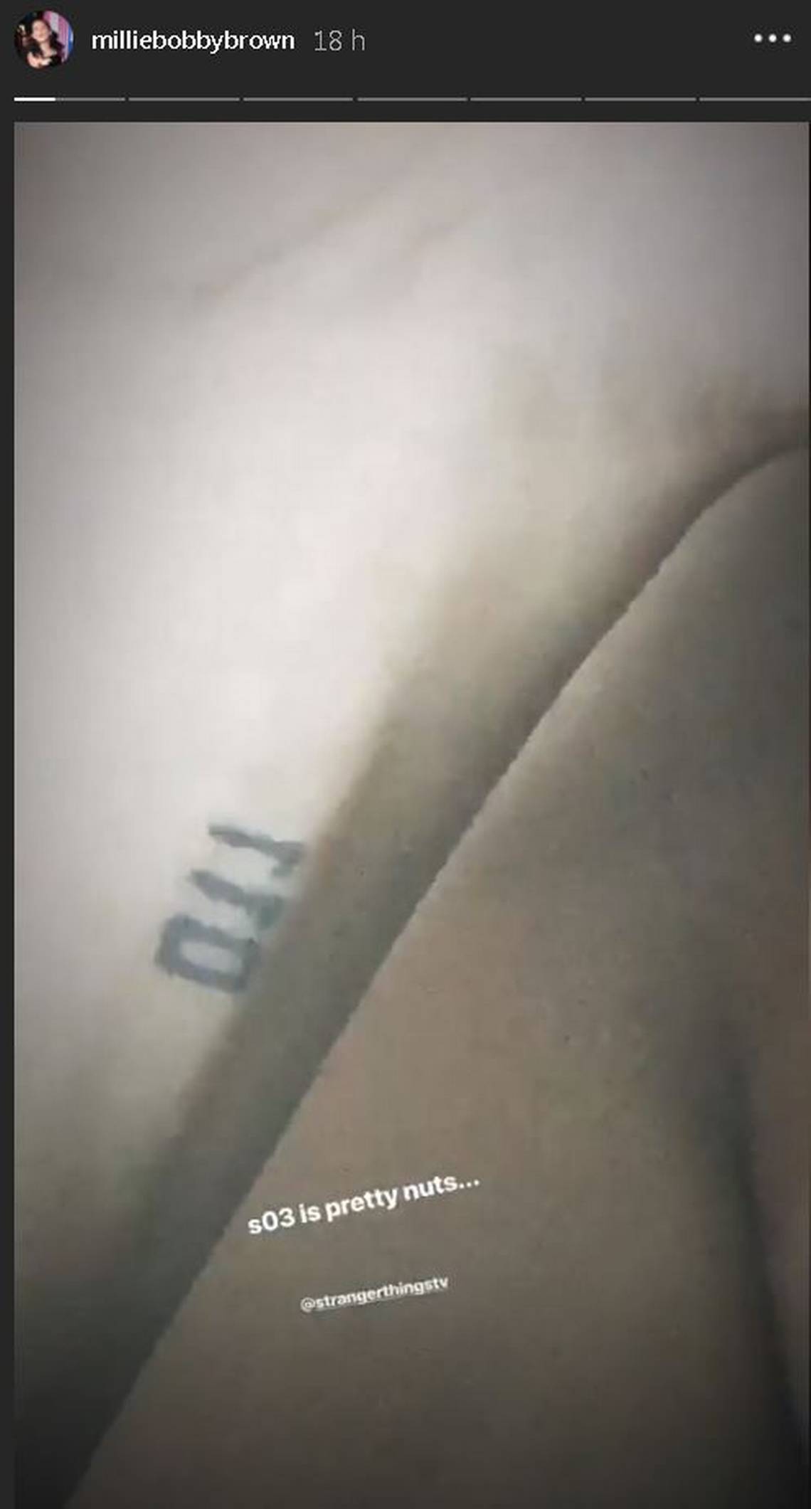 Millie Bobby Brown luce en su brazo el número "011", que corresponde justamente al nombre que lleva en la serie que la hizo famosa, "Stranger Things".