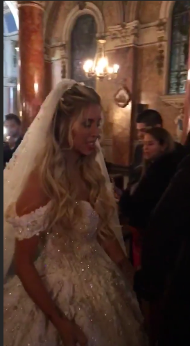En la ceremonia se le pudo ver con un vestido muy tradicional, estilo "princesa", color crema, con un velo muy largo que tenía bordados de flores.
