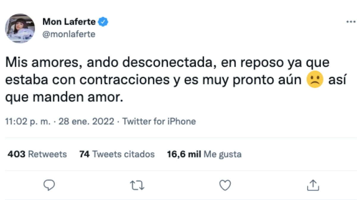 "Mis amores, ando desconectada y en reposo, ya que estaba con contracciones y es muy pronto aún. Así que manden amor", fue el breve mensaje con el que Mon Laferte preocupa a sus seguidores.