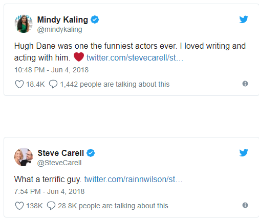 La actriz Mindy Kalling, escribió en Twitter: "Dane fue uno de los actores más divertidos. Amé escribir y actuar con él".
