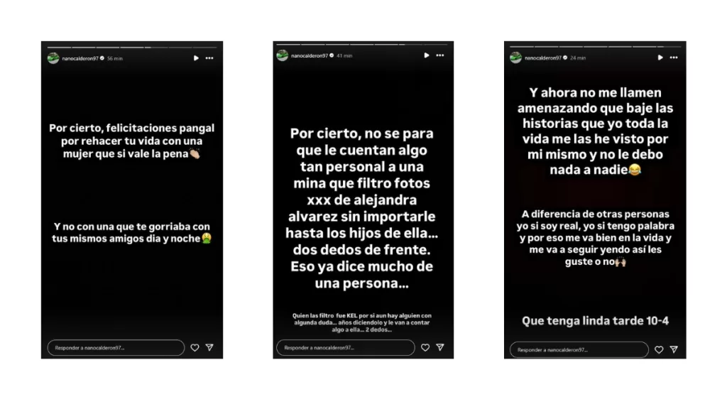 En la última parte del mensaje, Nano escribió: "Y ahora no me llamen amenazando que baje las historias, que yo toda la vida me las he visto por mi mismo y no le debo nada a nadie. A diferencia de otras personas yo sí soy real. Yo si tengo palabra y por eso me va bien en la vida y me va a seguir yendo", cerró.