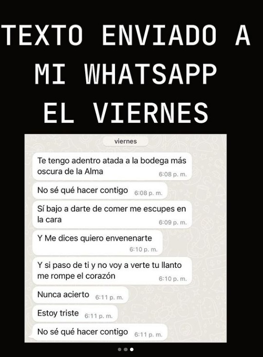 "Me sacabas celos e inventabas historias con quien podías. Acosaste a mis amigos y a mi con textos enfermos. Socavaste mi autoestima. Me invalidaste como profesional, como mujer como ser humano. Abusaste de mi en todos los ámbitos en que se puede".