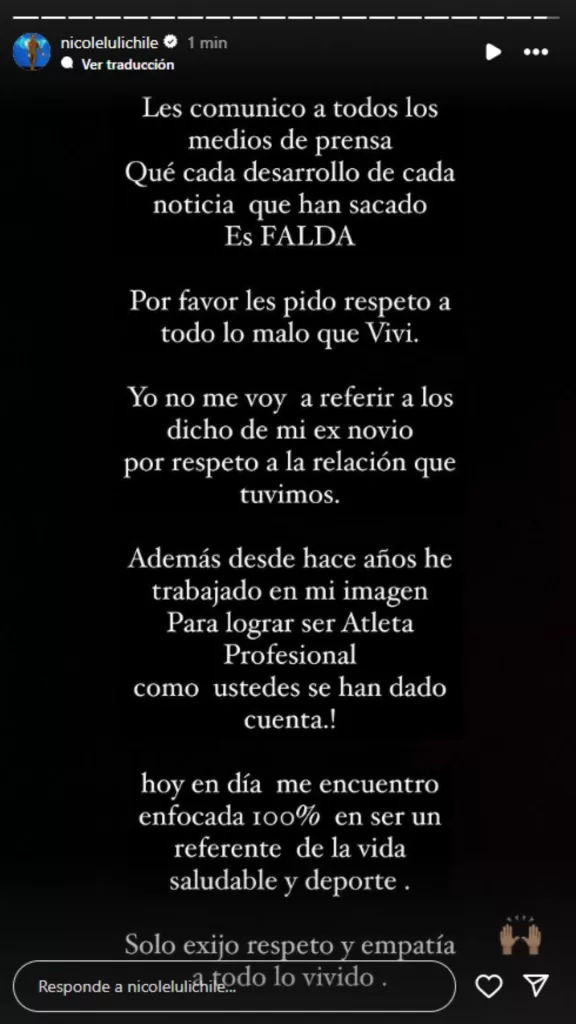 Posteriormente, Nicole Moreno compartió en su cuenta de Instagram un mensaje donde se refirió a la polémica buscando poner fin a los rumores sobre su vida privada.