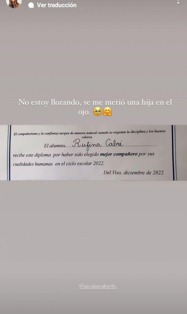 "El alumno Rufina Cabré recibe este diploma por haber sido elegido mejor compañero por sus cualidades humanas en el ciclo escolar 2022", dice el texto que recibió China Suárez en horas recientes. La actriz no dudó en compartir la emoción y el orgullo que sintió por Rufina.