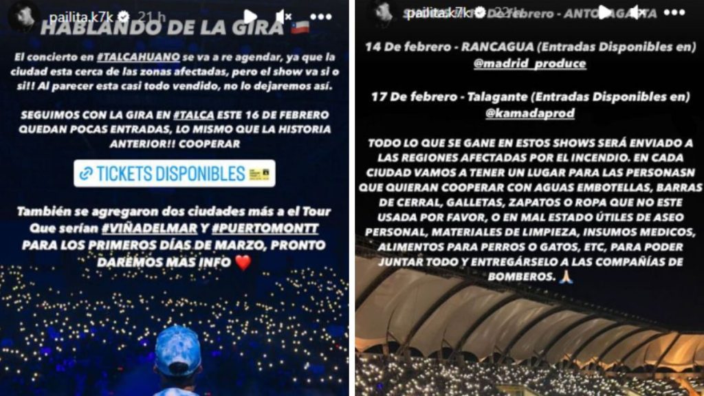 A través de su cuenta de Instagram, Pailita anunció que “todo lo que gane en estos shows será enviado a las regiones afectadas por el incendio”.