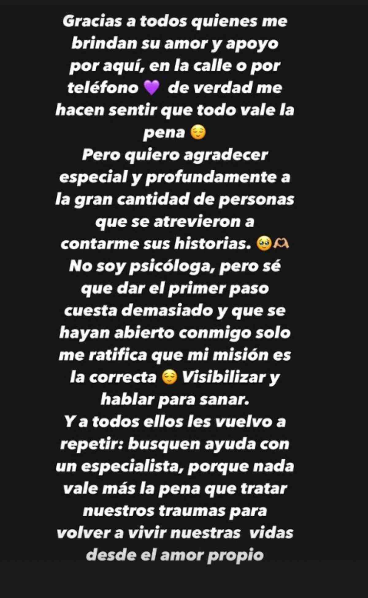"No soy psicóloga, pero sé que dar el primer paso cuesta demasiado y que se hayan abierto conmigo solo me ratifica que mi misión es la correcta. Visibilizar y hablar para sanar", destacó en la red social.