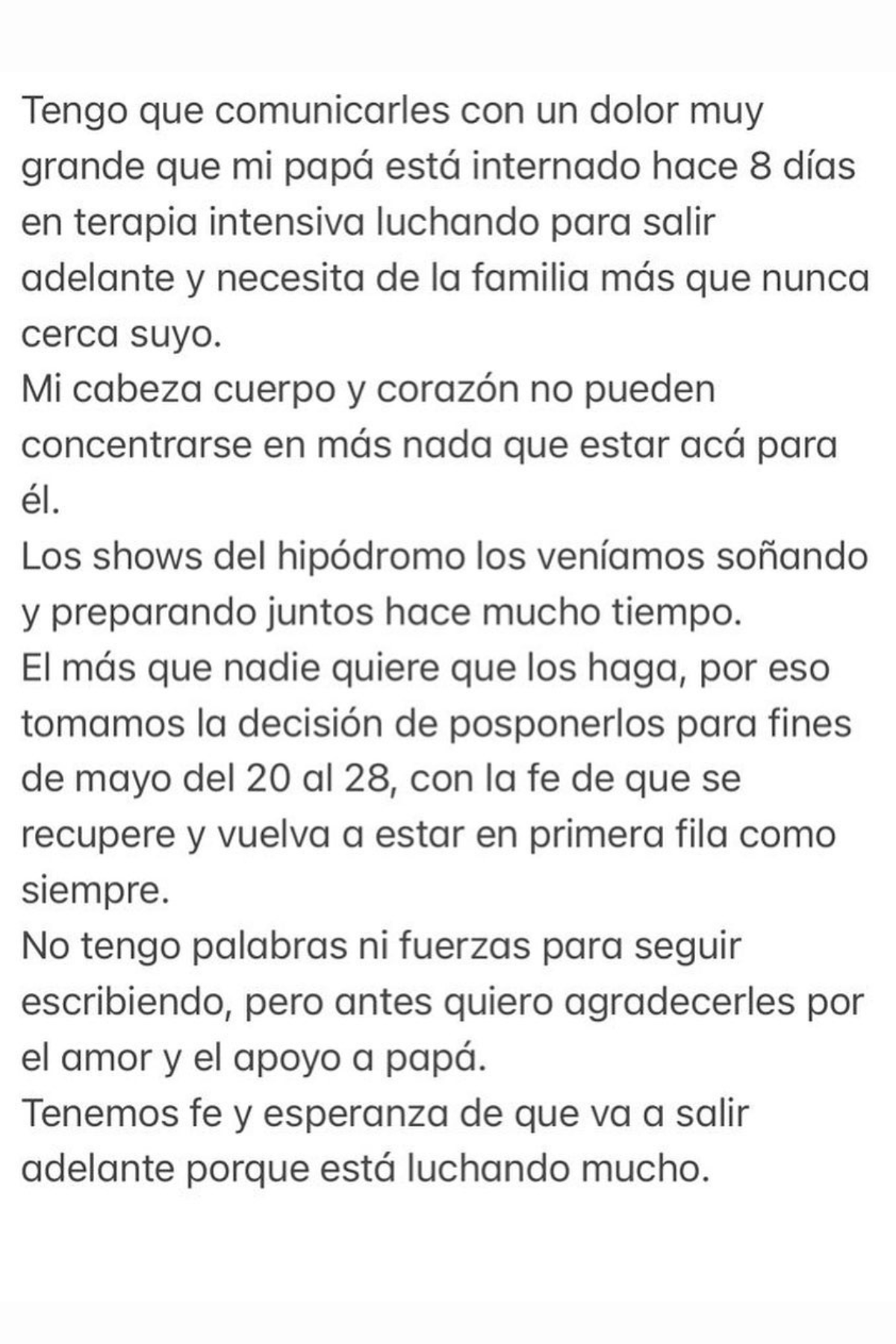 "Los shows del hipódromo los veníamos soñando y preparando juntos hace mucho tiempo. Él más que nadie quiere que los haga. Por eso tomamos la decisión de posponerlos para fines de mayo, del 20 al 28, con la fe de que se recupere y vuelva a estar en primera fila como siempre”, señaló el 10 de marzo pasado.