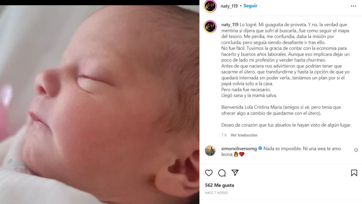 Y cuando ya han pasado las horas, esta vez fue el turno de Natalia Saavedra, pareja de Simón Oliveros, quien decidió dedicarle unas palabras a su hija Lola.