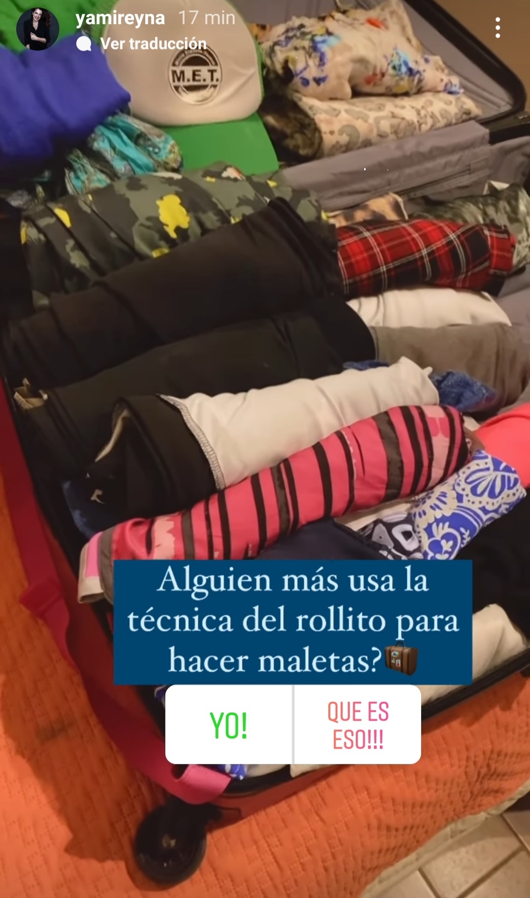 "¿Alguien más usa la técnica del rollito para hacer las maletas?", preguntó la comediante a través de Instagram Stories, evidenciando que ya le quedan pocas horas en Santiago.