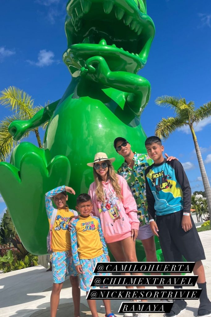 Las divertidas vacaciones de la familia, son en un resort ambientado en series infantiles del canal Nickelodeon. En una de las fotografías que subió Marité Matus en su Instagram, se puede ver a la modelo con sus hijos y su pololo posando frente a Reptar, dinosaurio de la icónica serie Rugrats.