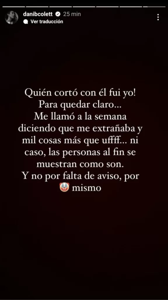 Minutos después de sus dichos Daniela Colett reaccionó en sus redes sociales sobre los dichos de su expareja, revelando que ella fue quien cortó la relación.