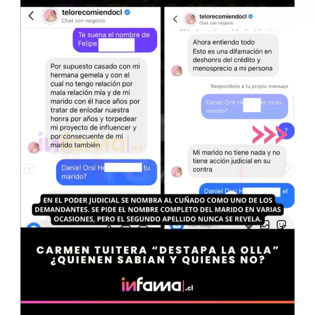Aunque no escribió nombres, Infama mostró el mensaje que le envió una usuaria señalando que Carmen se refería a la influencer Andrea Aninat. "La influencer es Andrea Aninat (Telorecomiendo). Y su marido es quien tiene causas, es público. Yo lo busqué y sale todo", se lee en la captura de pantalla.