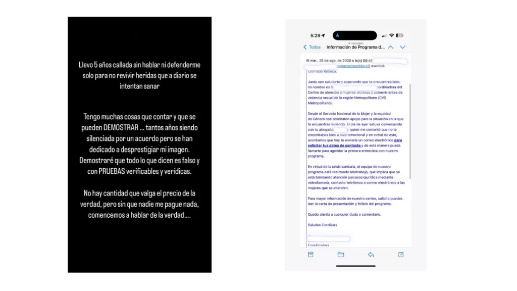 Más tarde y por el mismo medio, compartió un correo electrónico que había recibido de la coordinadora del Centro de Atención y Reparación para Mujeres Víctimas/Sobrevivientes de Violencia Sexual Metropolitano. Este correo se refiere a una querella que Rebeca presentó en 2020 contra su suegro, por acusaciones de acoso y abuso sexual reiterado.