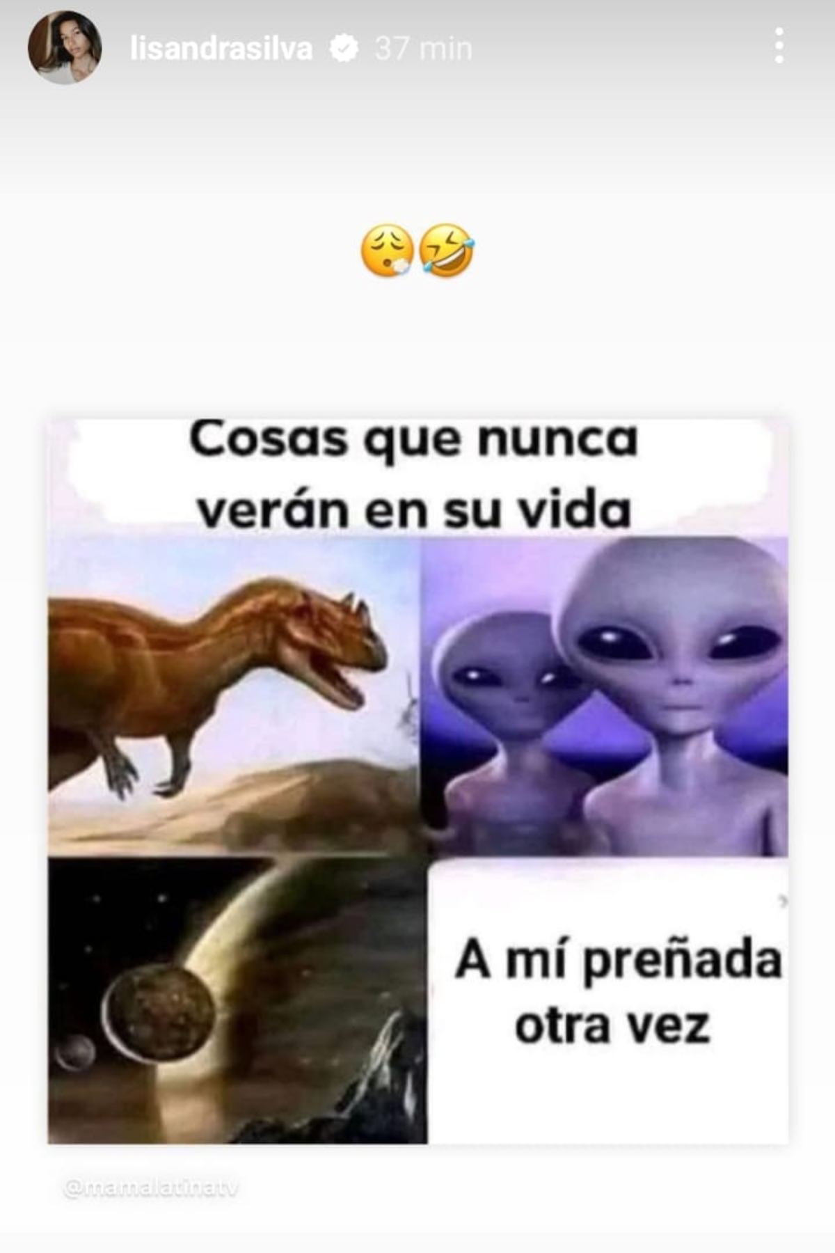 "Cosas que nunca verán en su vida", se puede leer en la imagen que compartió Lisandra Silva, junto a una imagen de un dinosaurio, ovnis, el universo y otra frase que decía: "A mí preñada otra vez".