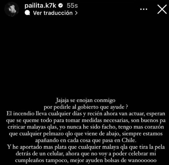 A eso, Pailita sumó: "Son buenos para criticar. Yo nunca he sido facho, tengo más corazón que cualquier pelmazo que viene de abajo. Siempre estamos apañando en cada cosa que pasa en Chile. Y he aportado más plata que cualquiera que tira la pelá detrás de un celular. Ahora no voy a poder celebrar mi cumpleaños tampoco, mejor ayuden".