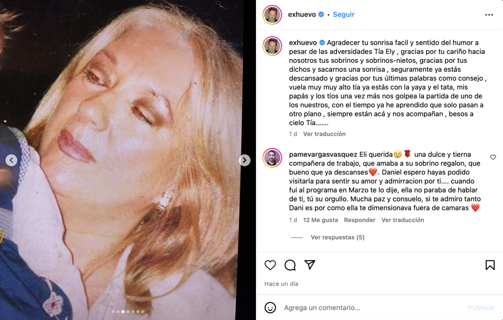 El conductor de Radio Activa despidió a su tía Ely con un emotivo carrusel de fotos, en las cuales se destaca su sonrisa y un momento en el que ambos comparten un feliz abrazo. Además, añadió a la publicación la famosa canción de amor titulada "Memory" de Richard Clayderman.