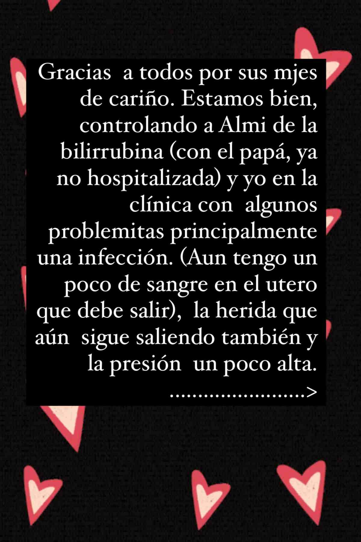 "Gracias a todos por sus mensajes de cariño. Estamos bien, controlando a Almi de la bilirrubina (con el papá, ya no hospitalizada) y yo en la clínica con algunos problemitas principalmente una infección. (Aun tengo un poco de sangre en el útero que debe salir) la herida que aun sigue saliendo también y la presión un poco alta”, indicó Sandra Staniscia.