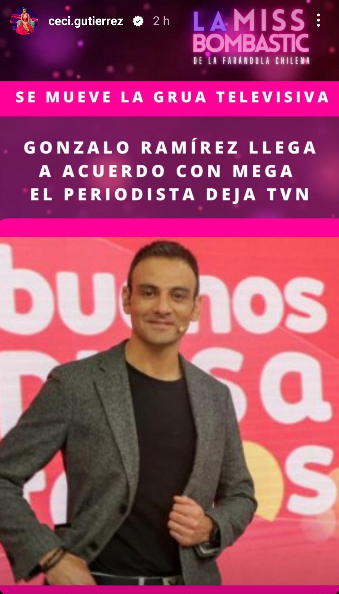 "Se mueve la grúa televisiva. Gonzalo Ramírez llega a acuerdo con Mega, el periodista deja TVN", expresó la periodista a través de una historia que subió a su cuenta de Instagram este jueves 29 de septiembre por la noche.