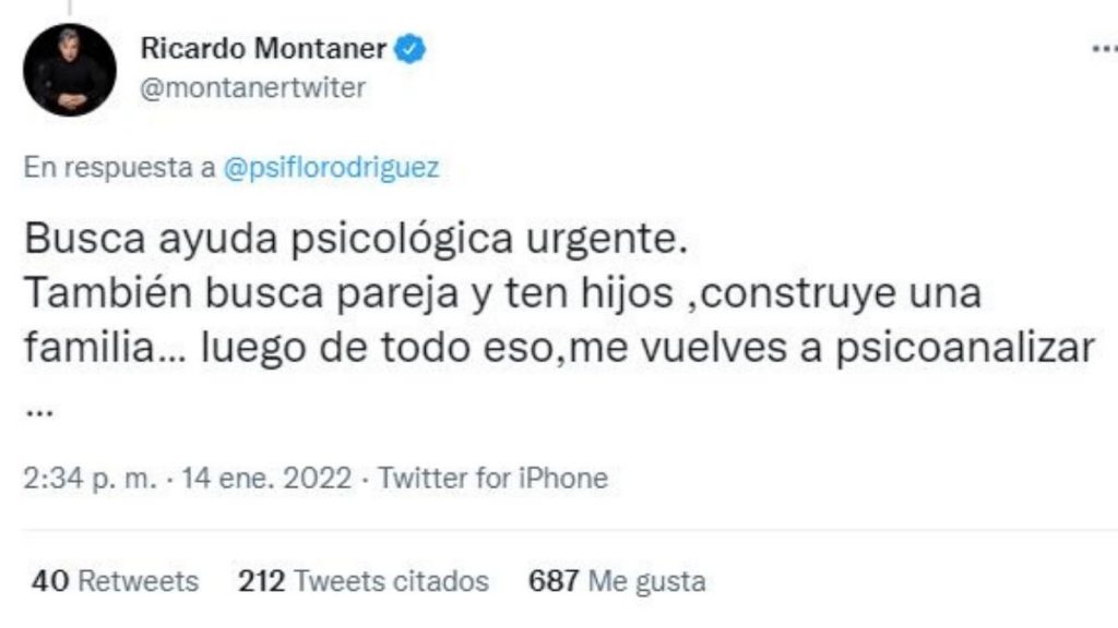 Varios días después de la publicación del Tweet donde se critica al cantante, Ricardo Montaner le escribió a la psicóloga diciendo, "busca ayuda psicológica urgente. También busca pareja y ten hijos ,construye una familia… luego de todo eso, me vuelves a psicoanalizar".