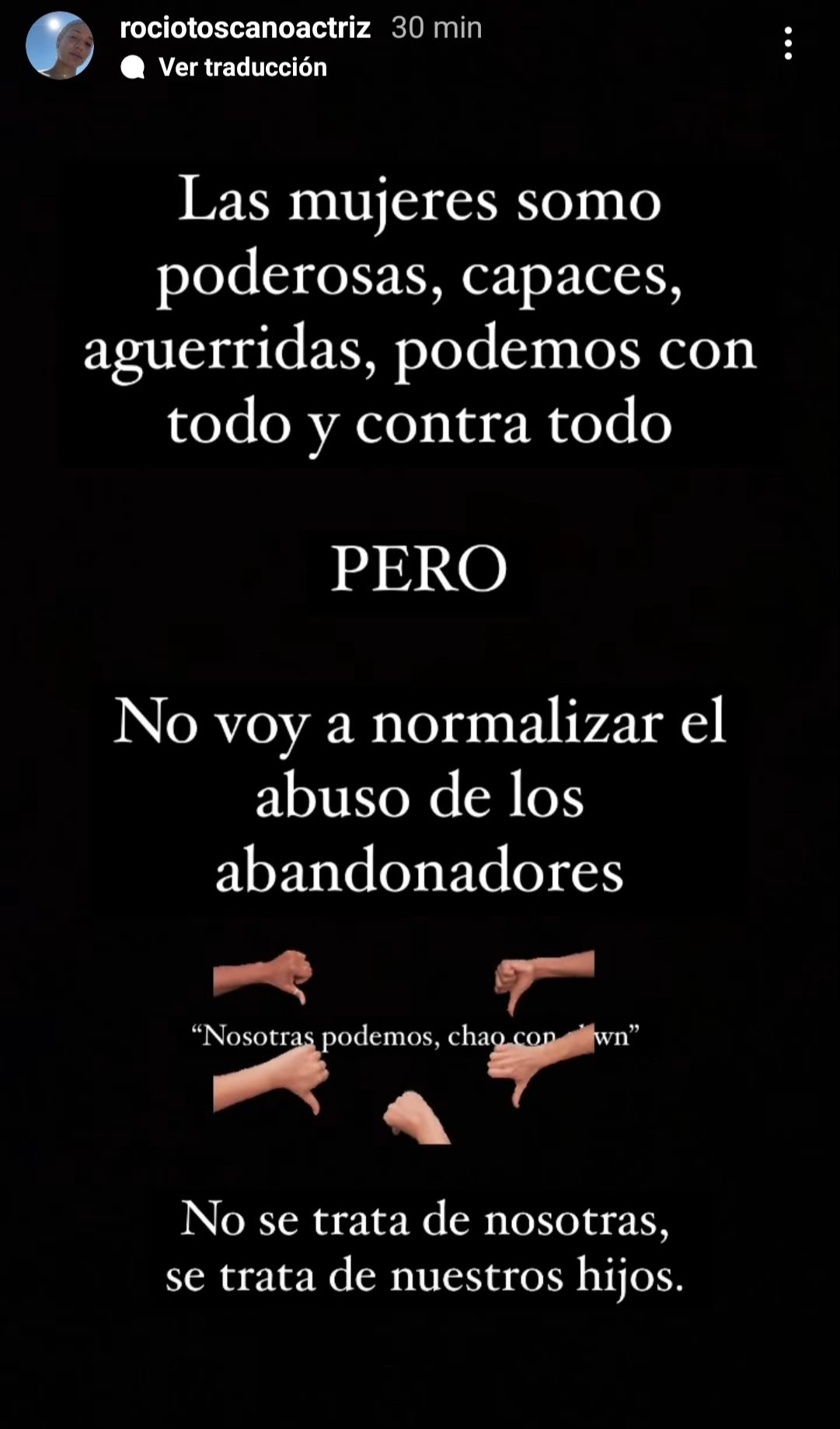 'Las mujeres somos poderosas, capaces aguerridas. Podemos con todo y contra todo, pero no voy a normalizar el abuso de los abandonadores. No se trata de nosotras, se trata de nuestros hijos', expresó Rocío Toscano en otra historia en su cuenta de Instagram.