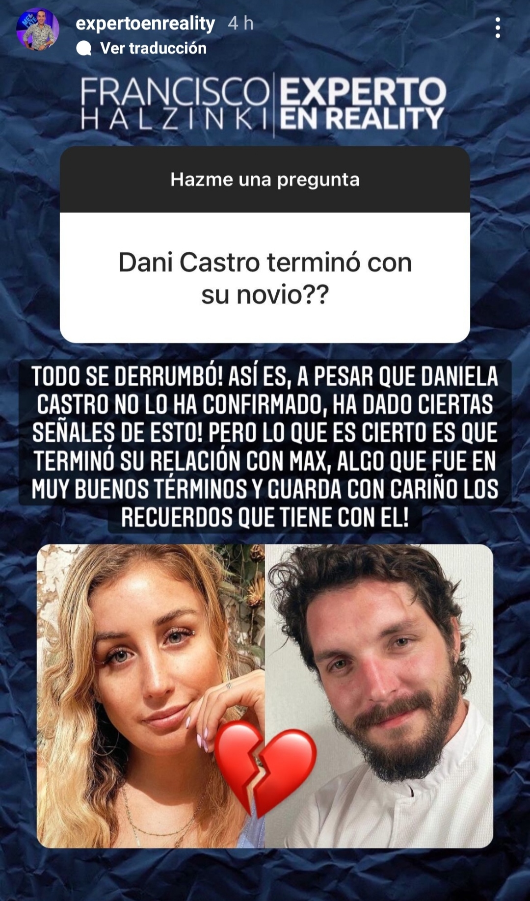 "Pero lo que es cierto es que terminó su relación con Max, algo que fue en muy buenos términos", agregó Halzinki, señalando que Daniela "guarda con cariño los recuerdos que tiene con él".
