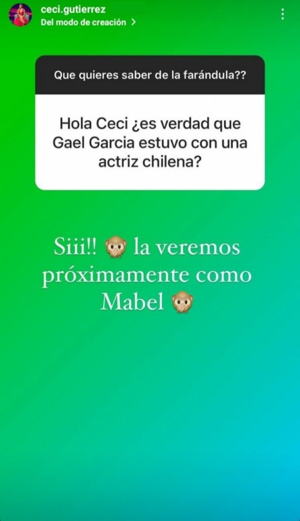 A través de su cuenta de Instagram, la comunicadora hizo una ronda de preguntas y respuestas en sus historias, donde una persona le preguntó: "Hola Ceci, ¿Es verdad que Gael García estuvo con una actriz chilena?".