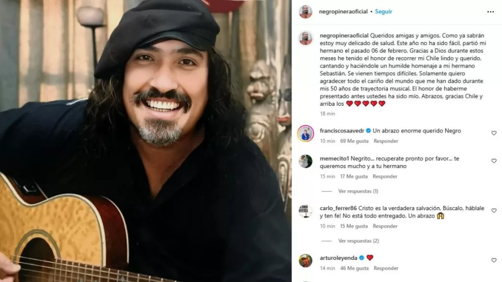 "Se vienen tiempos difíciles. Solamente quiero agradecer todo el cariño del mundo que me han dado durante mis 50 años de trayectoria musical. El honor de haberme presentado antes ustedes ha sido mío. Abrazos, gracias Chile y arriba los ❤️❤️❤️❤️❤️", agregó Negro Piñera recibiendo mensajes de apoyo.