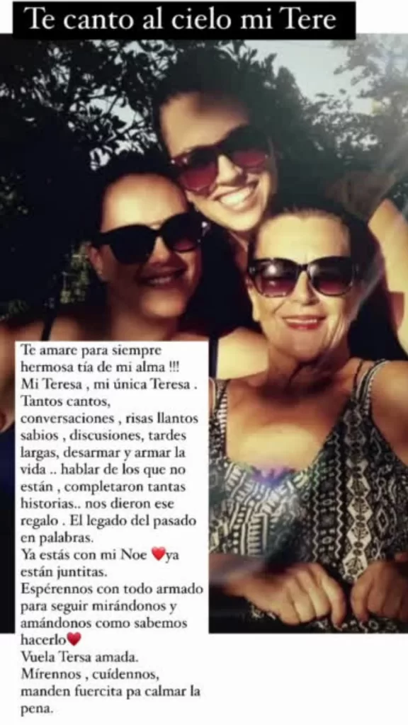 Además, entre las conmovedoras palabras, la actriz de Generación 98, aseguró que necesitará fuerzas para sobre llevar la triste pena que estaría pasando junto a sus familiares. Aseguró que espera algún día reencontrarse con Teresa y con Noe, ambas ya están juntas y acompañándose. La actriz recalcó que espera seguir mirándose y amándose como saben hacerlo y les pidió que la acompañen durante este fuerte proceso.