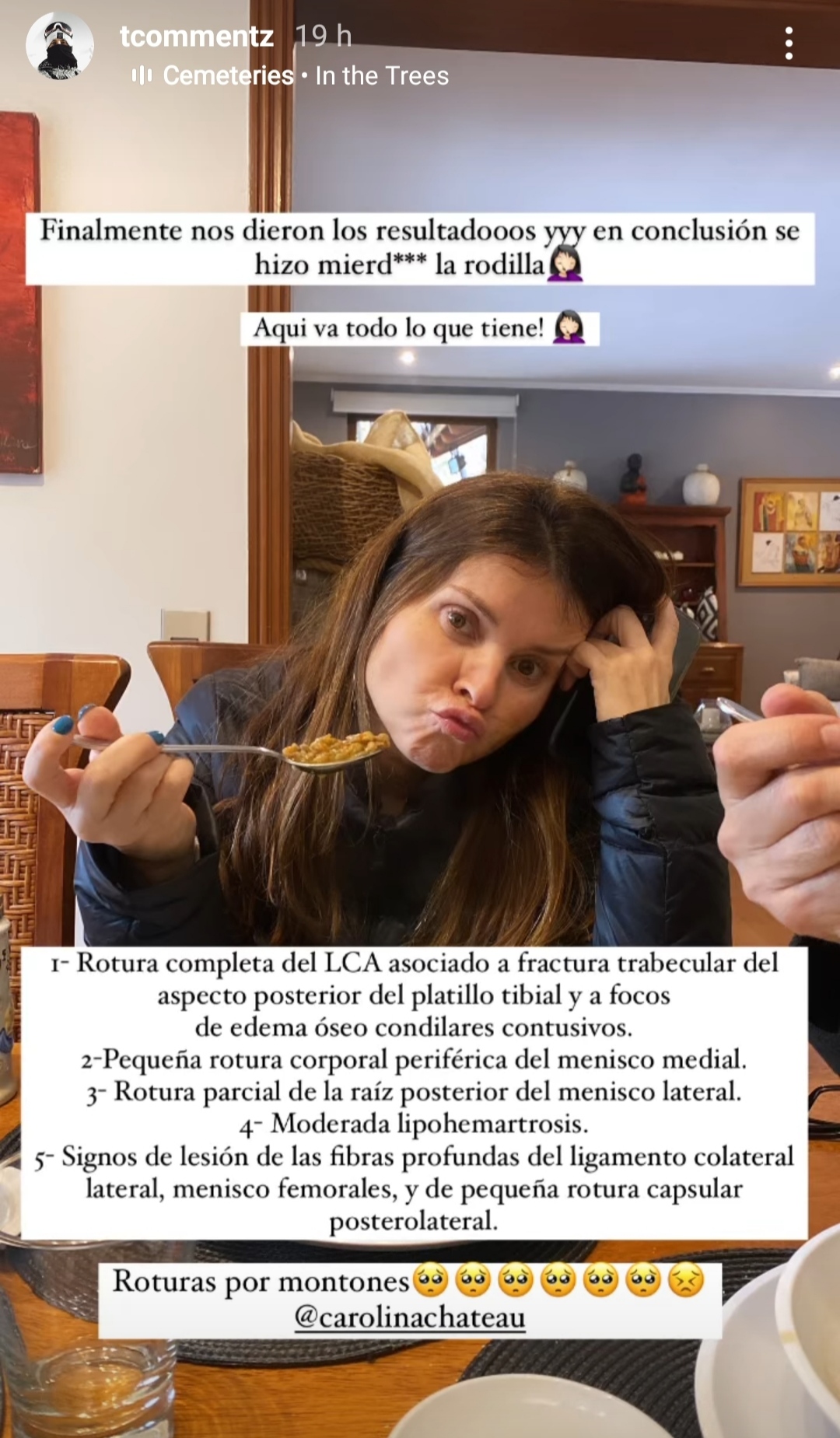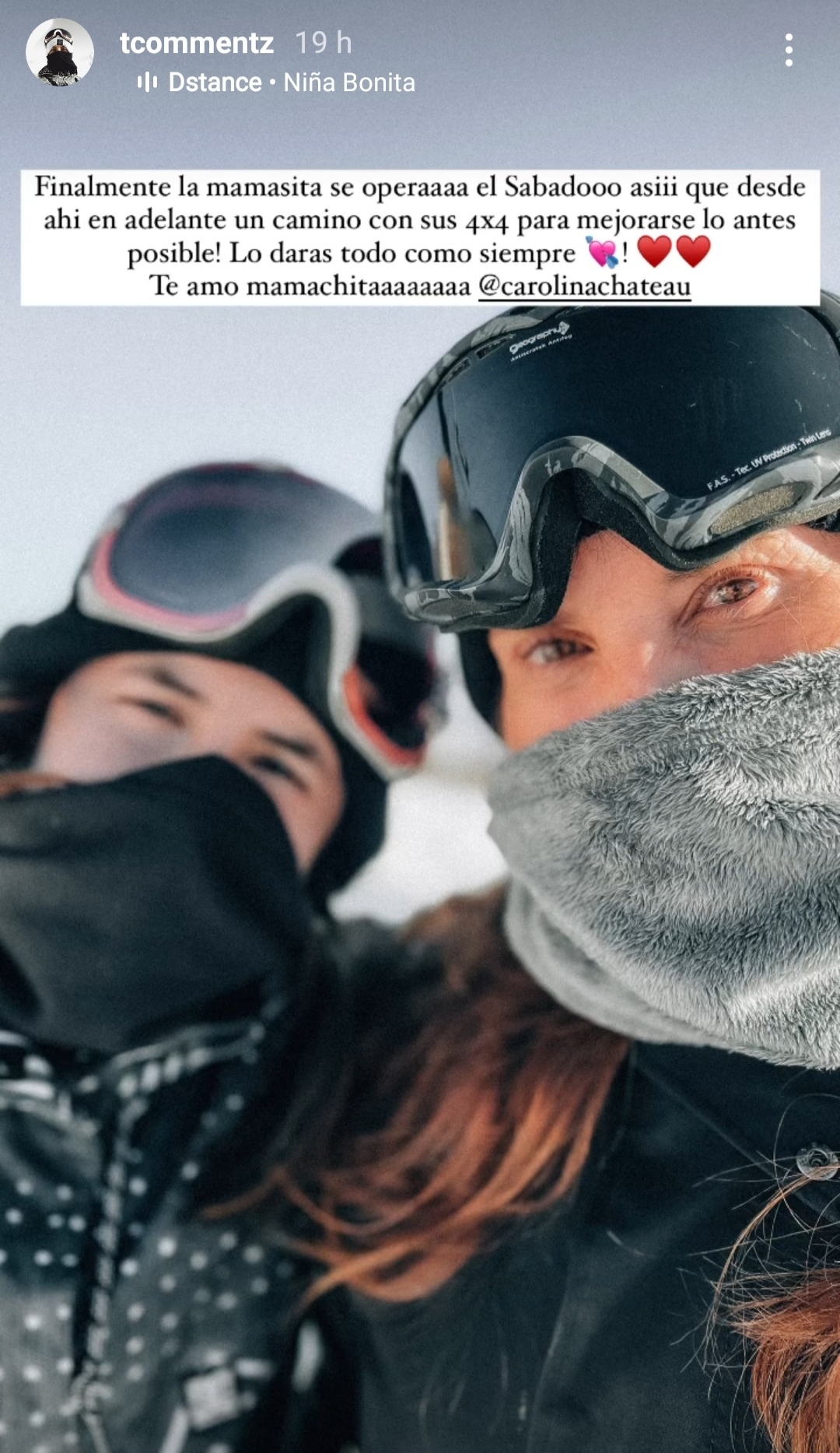 "Íbamos a camino a buscar a mi papá a la clínica y nos teníamos que ir esquiando... Mi mamá iba esquiando y se le enredaron sus ski. Y se le fue la pierna hacia atrás! La rodilla murió", siguió narrando Teresita Commentz en las historias que subió a su cuenta de Instagram.